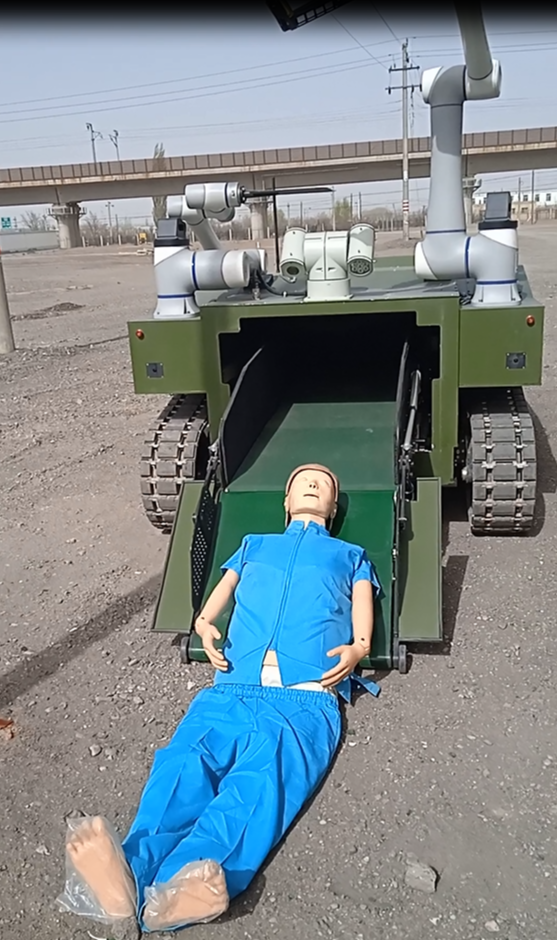 (2)使用推土铲、桁架、机械手将伤员清理出废墟,并使用伸缩式救生床把目标人员传送到机器人救援舱内;机器人撤离事故现场后行驶至安全位置,再将伤员传送出来,实现后续救护工作。